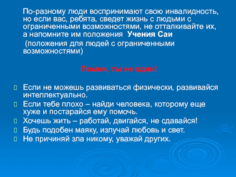 сведет жизнь с людьми с ограниченными возможностями, не отталкивайте их, а напомните им положения Учения Саи
