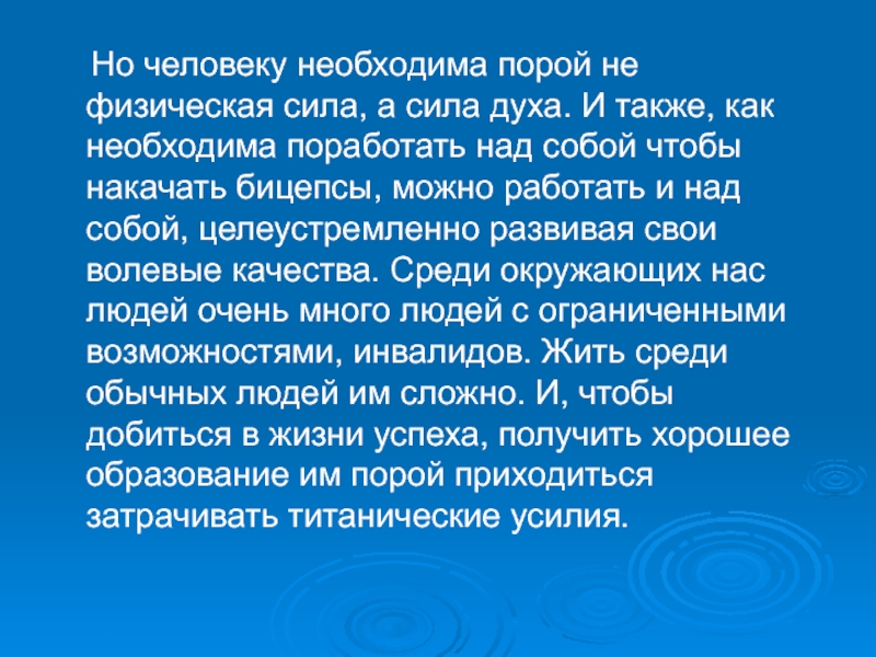 духа. И также, как необходима поработать над собой чтобы накачать бицепсы, можно работать и над собой, целеустремленно развивая свои волевые качества. Среди окружающих нас людей очень много людей с ограниченными возможностями, инвалидов. Жить среди обычных людей им сложно. И, чтобы добиться в жизни успеха, получить хорошее образование им порой приходиться затрачивать титанические усилия.
