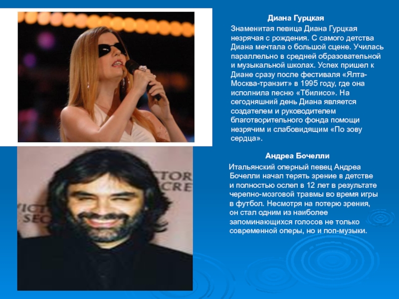 Знаменитая певица Диана Гурцкая незрячая с рождения. С самого детства Диана мечтала о большой сцене. Училась параллельно в средней образовательной и музыкальной школах. Успех пришел к Диане сразу после фестиваля «Ялта-Москва-транзит» в 1995 году, где она исполнила песню «Тбилисо». На сегодняшний день Диана является создателем и руководителем благотворительного фонда помощи незрячим и слабовидящим «По зову сердца».