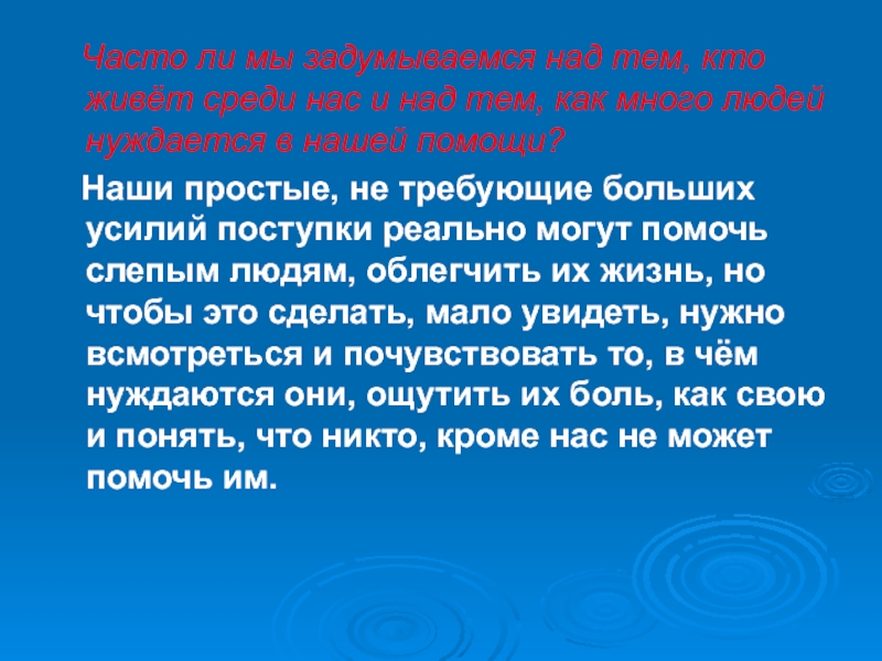 Наши простые, не требующие больших усилий поступки реально могут помочь слепым людям, облегчить их жизнь, но чтобы это сделать, мало увидеть, нужно всмотреться и почувствовать то, в чём нуждаются они, ощутить их боль, как свою и понять, что никто, кроме нас не может помочь им.