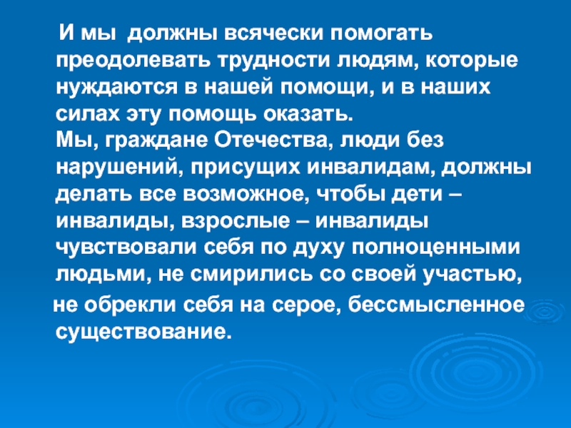 Мы, граждане Отечества, люди без нарушений, присущих инвалидам, должны делать все возможное, чтобы дети – инвалиды, взрослые – инвалиды чувствовали себя по духу полноценными людьми, не смирились со своей участью,