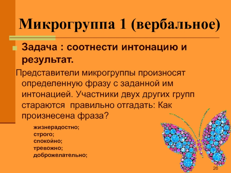 определенную фразу с заданной им интонацией. Участники двух других групп стараются правильно отгадать: Как произнесена фраза?