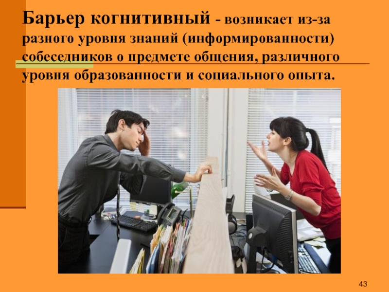 Слайд 43Барьер когнитивный - возникает из-за разного уровня знаний (информированности) собеседников о
