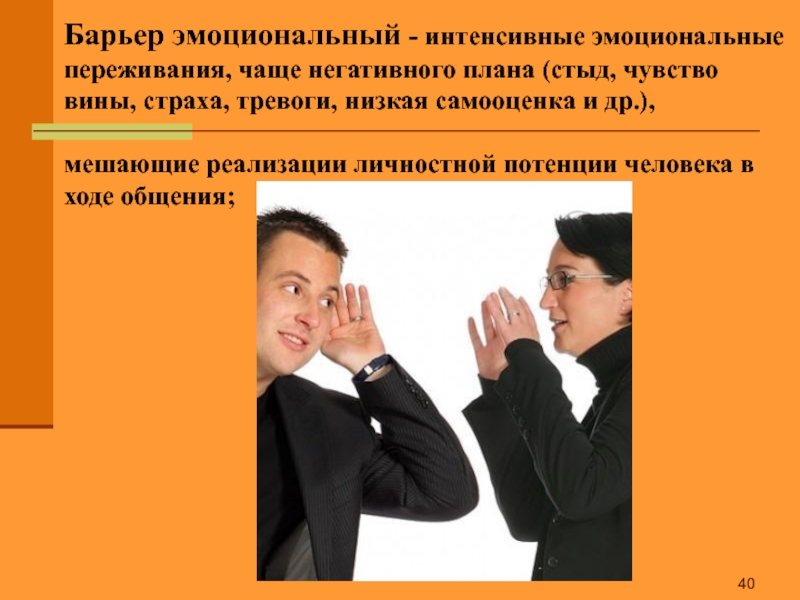Слайд 40Барьер эмоциональный - интенсивные эмоциональные переживания, чаще негативного плана (стыд, чувство