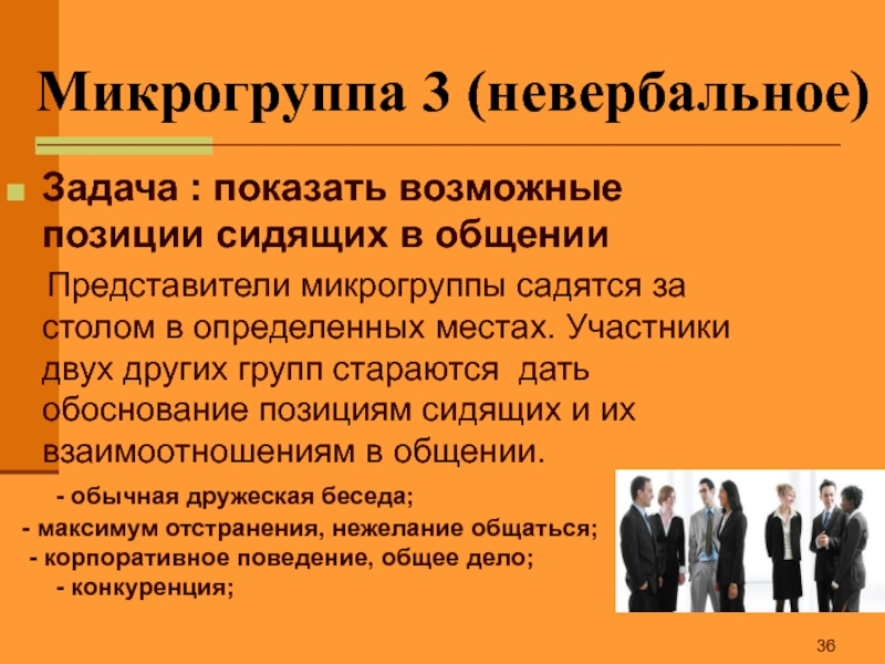 Представители микрогруппы садятся за столом в определенных местах. Участники двух других групп стараются дать обоснование позициям сидящих и их взаимоотношениям в общении.