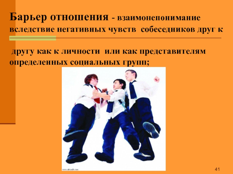 Слайд 41Барьер отношения - взаимонепонимание вследствие негативных чувств собеседников друг к