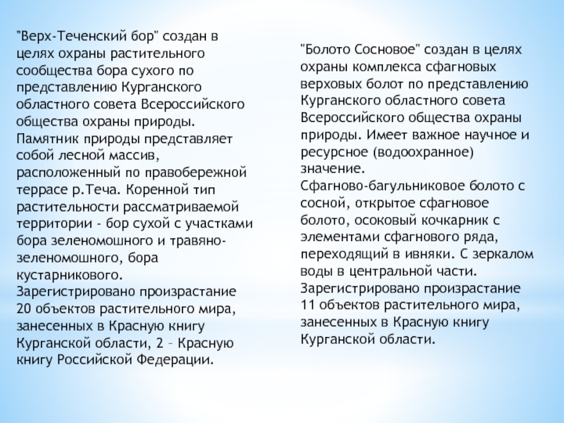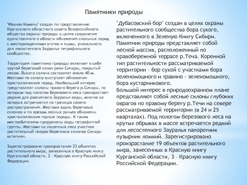 Большой интерес в природоохранном плане представляют собой лесные склоны глубоких оврагов по правому берегу р.Течи на севере рассматриваемой территории (в 24 и 25 кварталах). Под пологом березового леса на крутых обрывах в массе встречается редкий для лесостепного Зауралья папоротник пузырник ломкий. Зарегистрировано произрастание 19 объектов растительного мира, занесенных в Красную книгу Курганской области, 3 – Красную книгу Российской Федерации.