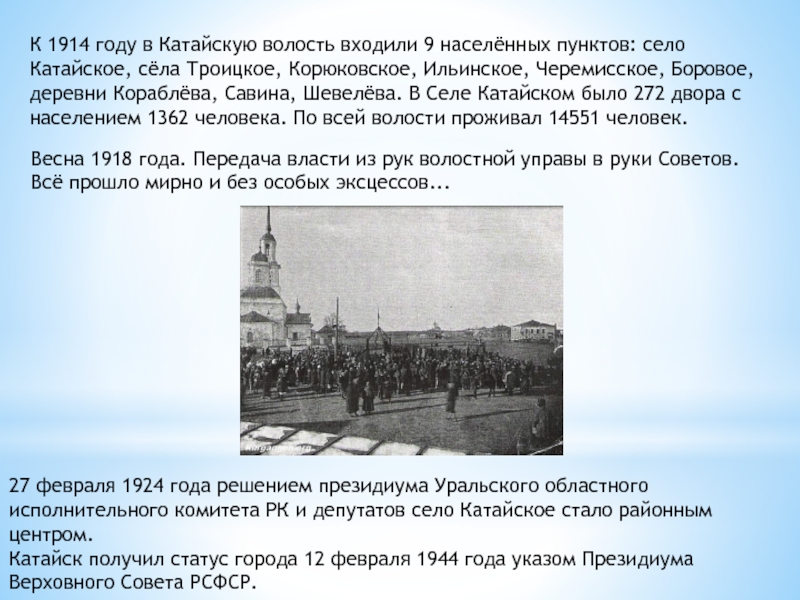27 февраля 1924 года решением президиума Уральского областного исполнительного комитета РК и депутатов село Катайское стало районным центром.