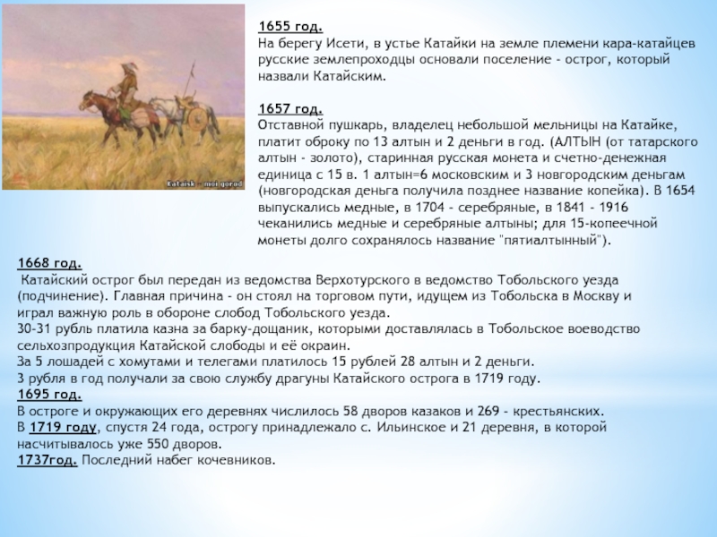30-31 рубль платила казна за барку-дощаник, которыми доставлялась в Тобольское воеводство сельхозпродукция Катайской слободы и её окраин.