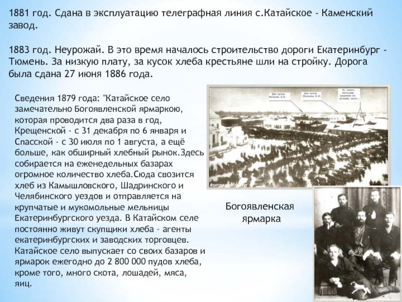 Сведения 1879 года: "Катайское село замечательно Богоявленской ярмаркою, которая проводится два раза в год, Крещенской - с 31 декабря по 6 января и Спасской - с 30 июля по 1 августа, а ещё больше, как обширный хлебный рынок.Здесь собирается на еженедельных базарах огромное количество хлеба.Сюда свозится хлеб из Камышловского, Шадринского и Челябинского уездов и отправляется на крупчатые и мукомольные мельницы Екатеринбургского уезда. В Катайском селе постоянно живут скупщики хлеба - агенты екатеринбургских и заводских торговцев.Катайское село выпускает со своих базаров и ярмарок ежегодно до 2 800 000 пудов хлеба, кроме того, много скота, лошадей, мяса, яиц.