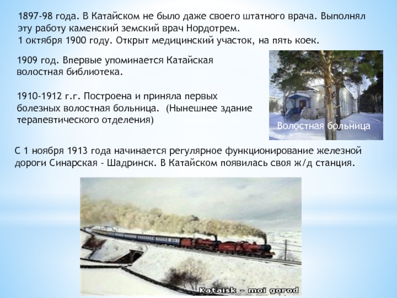 С 1 ноября 1913 года начинается регулярное функционирование железной дороги Синарская - Шадринск. В Катайском появилась своя ж/д станция.