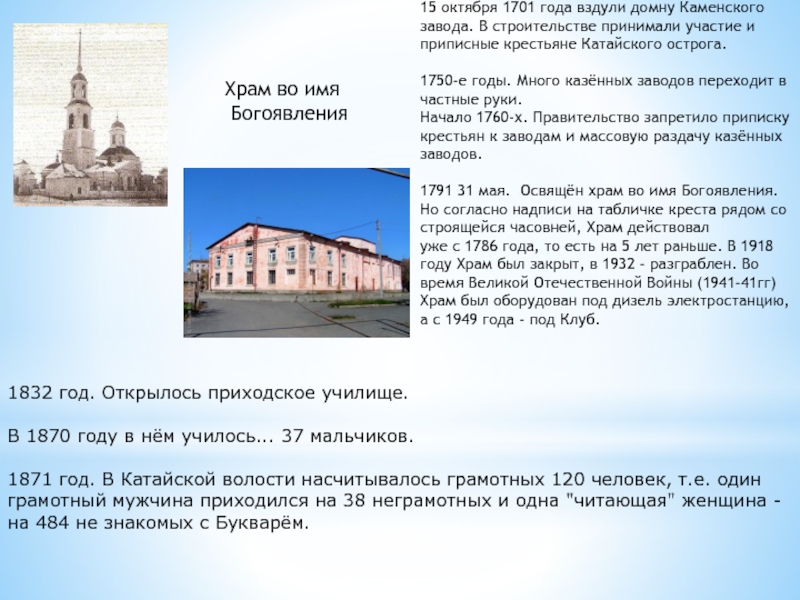 1871 год. В Катайской волости насчитывалось грамотных 120 человек, т.е. один грамотный мужчина приходился на 38 неграмотных и одна "читающая" женщина - на 484 не знакомых с Букварём.