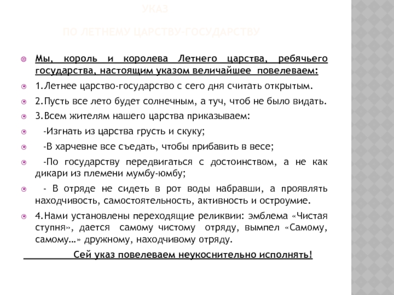 Мы, король и королева Летнего царства, ребячьего государства, настоящим указом величайшее повелеваем: