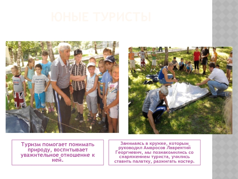 Занимаясь в кружке, которым руководил Амвросов Лаврентий Георгиевич, мы познакомились со снаряжением туриста, учились ставить палатку, разжигать костер.