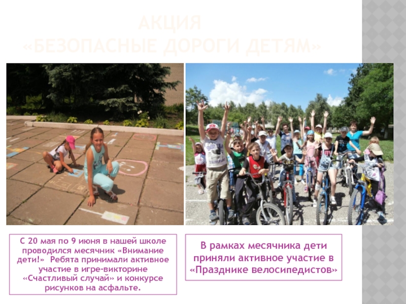C 20 мая по 9 июня в нашей школе проводился месячник «Внимание дети!» Ребята принимали активное участие в игре-викторине «Счастливый случай» и конкурсе рисунков на асфальте.