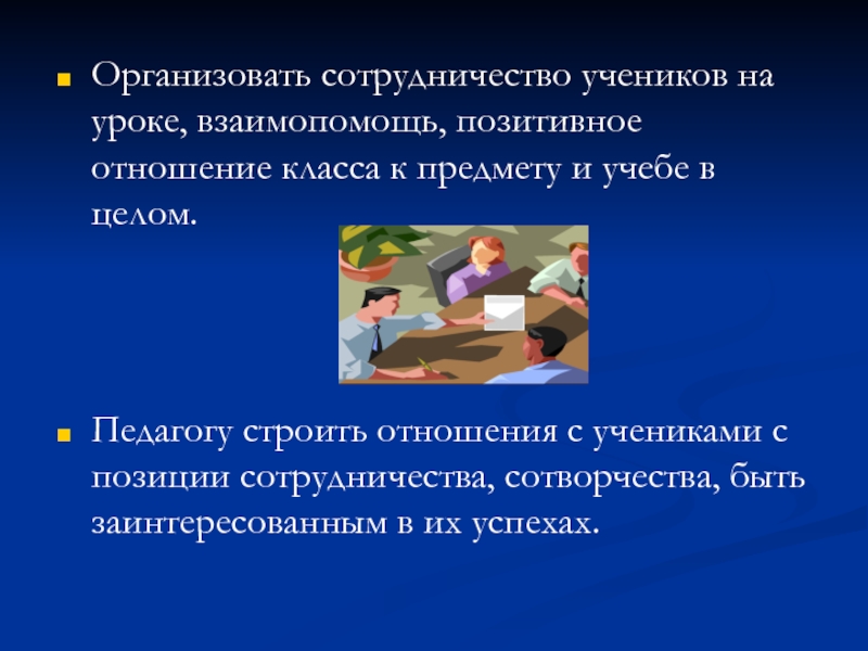 Слайд 22Организовать сотрудничество учеников на уроке, взаимопомощь, позитивное отношение класса к предмету