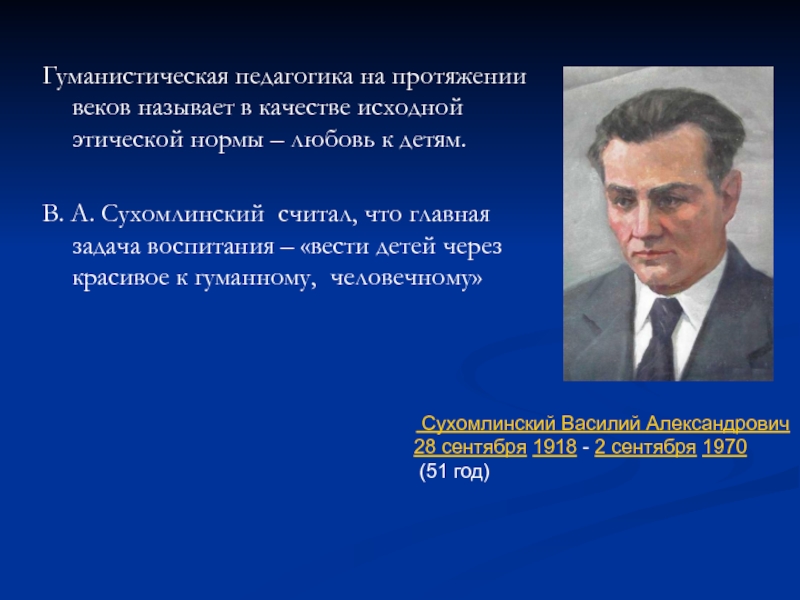 В. А. Сухомлинский считал, что главная задача воспитания – «вести детей через красивое к гуманному, человечному»
