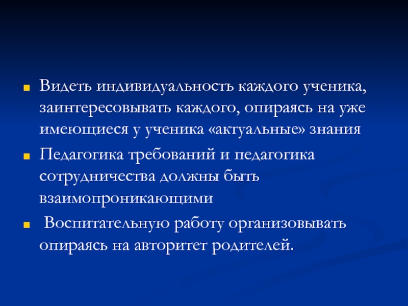 Педагогу строить отношения с учениками с позиции сотрудничества, сотворчества, быть заинтересованным в их успехах.
