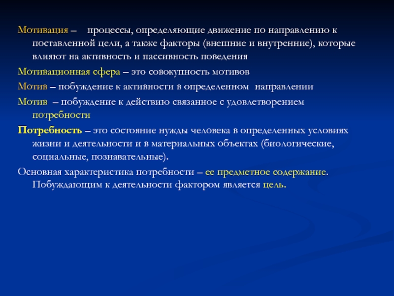 Слайд 7Мотивация – процессы, определяющие движение по направлению к поставленной цели,