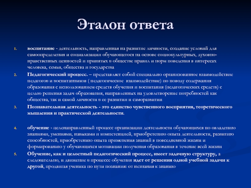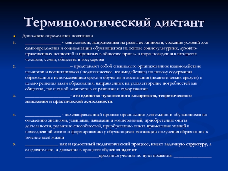 _______________ - целенаправленный процесс организации деятельности обучающихся по овладению знаниями, умениями, навыками и компетенцией, приобретению опыта деятельности, развитию способностей, приобретению опыта применения знаний в повседневной жизни и формированию у обучающихся мотивации получения образования в течение всей жизни