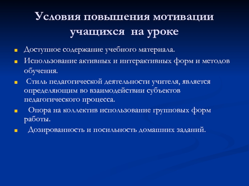 Слайд 24Условия повышения мотивации учащихся на уроке