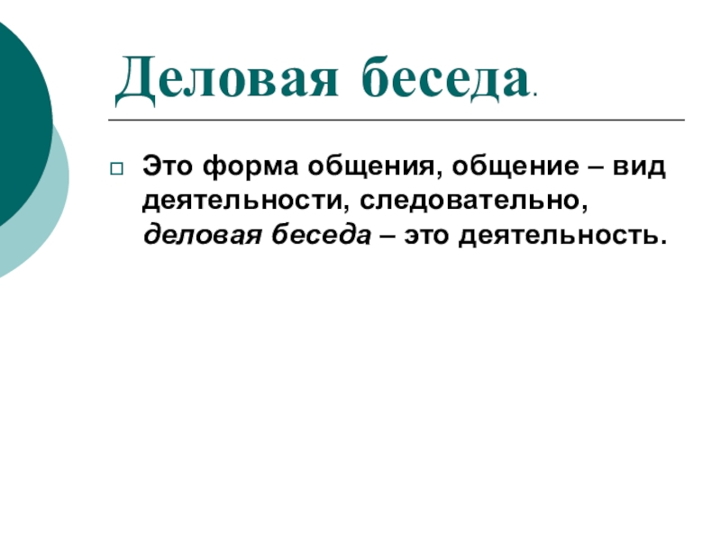 Это форма общения, общение – вид деятельности, следовательно, деловая беседа