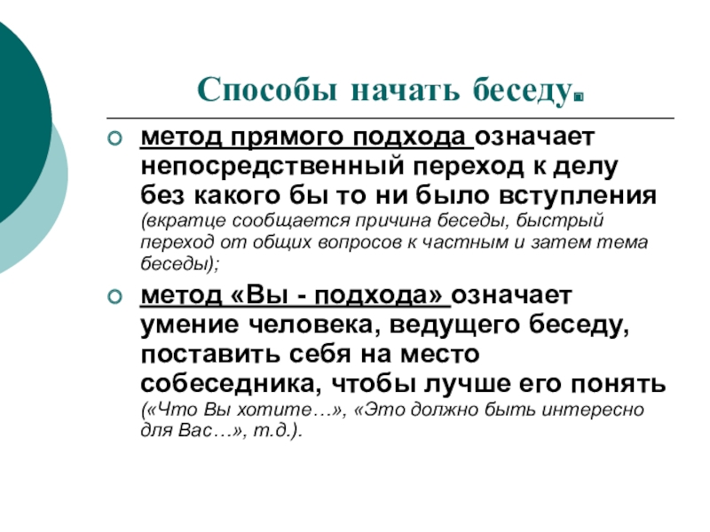 метод «Вы - подхода» означает умение человека, ведущего беседу, поставить себя на место собеседника, чтобы лучше его понять («Что Вы хотите…», «Это должно быть интересно для Вас…», т.д.).