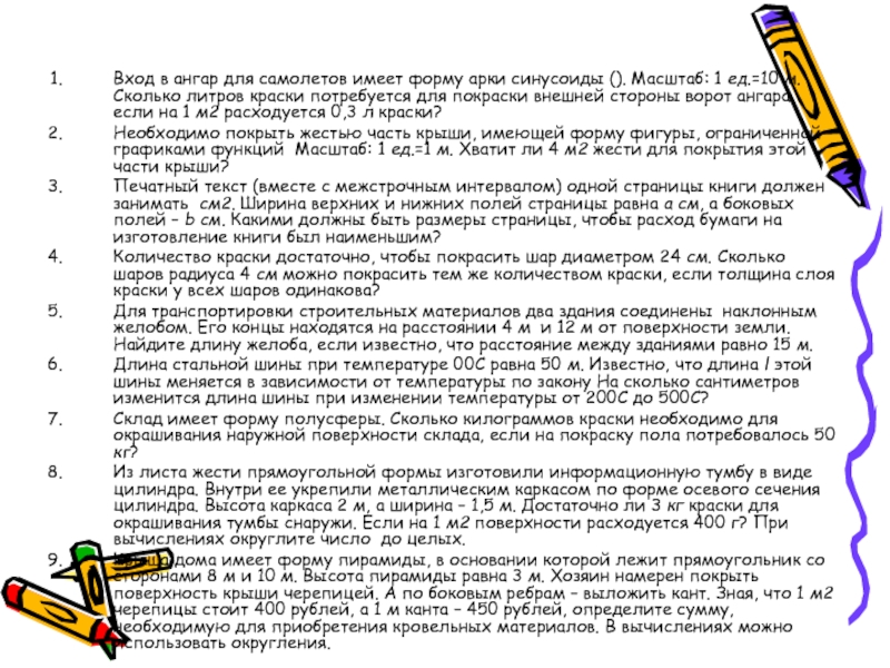 форму арки синусоиды (). Масштаб: 1 ед.=10 м. Сколько литров краски потребуется для покраски внешней стороны ворот ангара, если на 1 м2 расходуется 0,3 л краски?