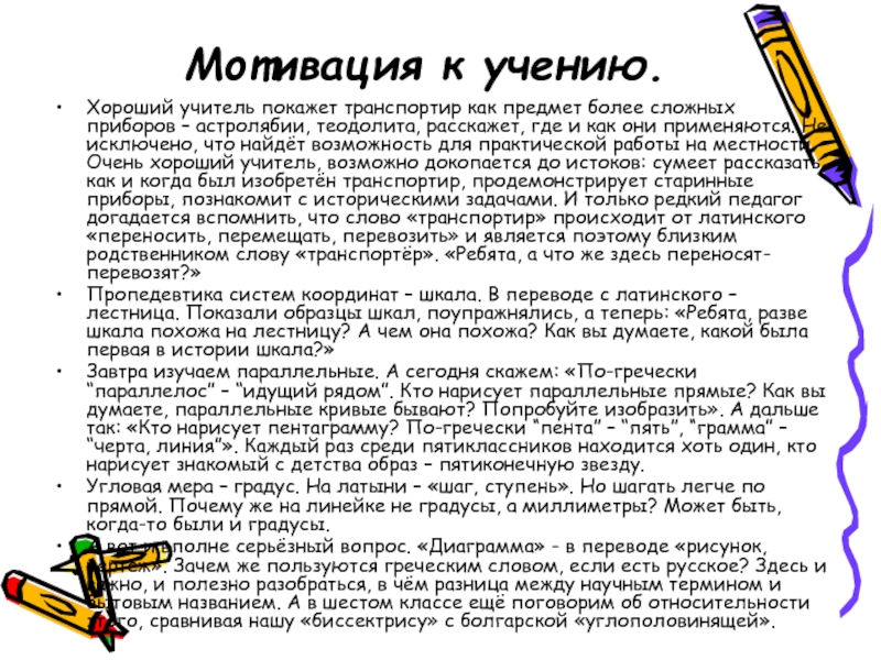 – астролябии, теодолита, расскажет, где и как они применяются. Не исключено, что найдёт возможность для практической работы на местности. Очень хороший учитель, возможно докопается до истоков: сумеет рассказать, как и когда был изобретён транспортир, продемонстрирует старинные приборы, познакомит с историческими задачами. И только редкий педагог догадается вспомнить, что слово «транспортир» происходит от латинского «переносить, перемещать, перевозить» и является поэтому близким родственником слову «транспортёр». «Ребята, а что же здесь переносят-перевозят?»