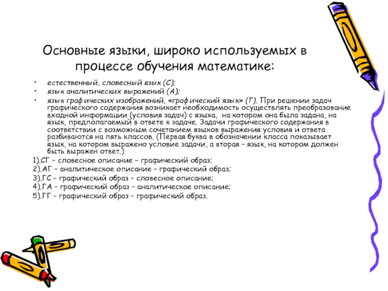 язык графических изображений, «графический язык» (Г). При решении задач графического содержания возникает необходимость осуществлять преобразование входной информации (условия задач) с языка, на котором она была задана, на язык, предполагаемый в ответе к задаче. Задачи графического содержания в соответствии с возможным сочетанием языков выражения условия и ответа разбиваются на пять классов. (Первая буква в обозначении класса показывает язык, на котором выражено условие задачи, а вторая – язык, на котором должен быть выражен ответ.)