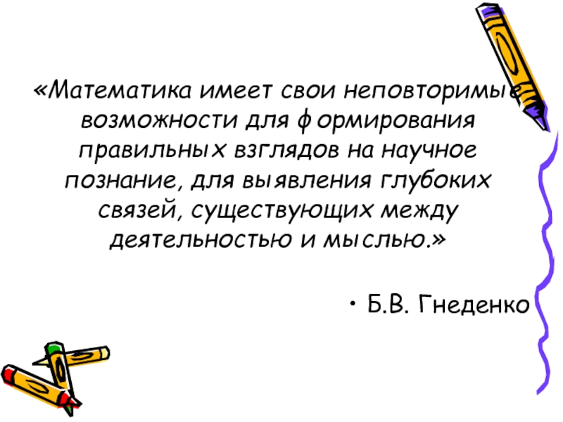 Слайд 22«Математика имеет свои неповторимые возможности для формирования правильных взглядов на научное