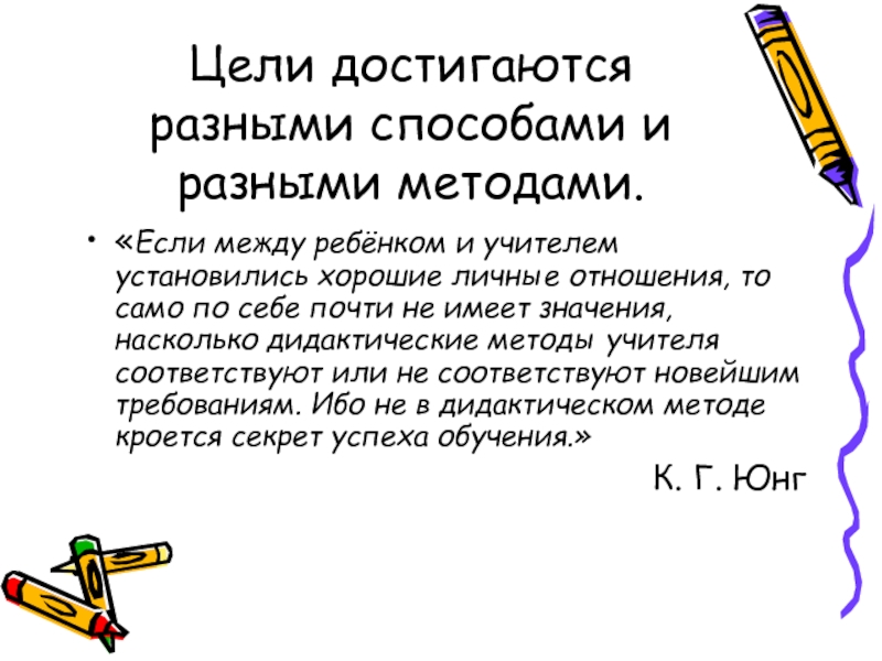 установились хорошие личные отношения, то само по себе почти не имеет значения, насколько дидактические методы учителя соответствуют или не соответствуют новейшим требованиям. Ибо не в дидактическом методе кроется секрет успеха обучения.»