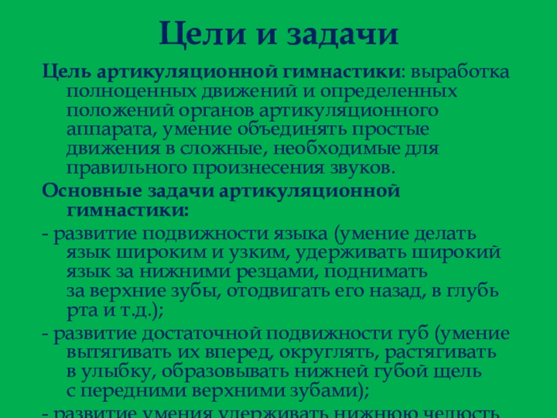 Цели и задачиЦель артикуляционной гимнастики: выработка полноценных движений и определенных положений органов артикуляционного аппарата, умение объединять простые движения в сложные, необходимые для правильного произнесения звуков.Основные задачи артикуляционной гимнастики:- развитие подвижности языка (умение делать язык широким и узким,