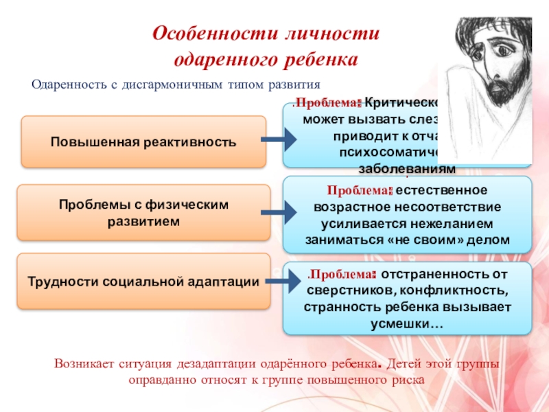 Возникает ситуация дезадаптации одарённого ребенка. Детей этой группы оправданно относят к группе повышенного риска