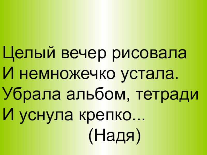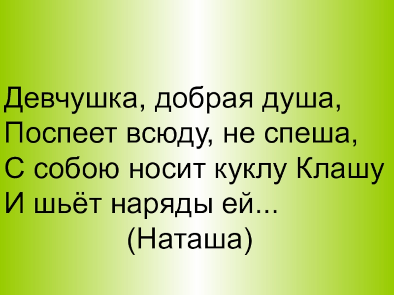 Девчушка, добрая душа,Поспеет всюду, не спеша,С собою носит куклу Клашу   И шьёт наряды ей...