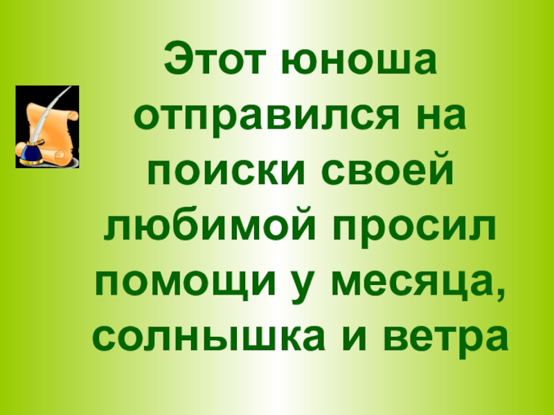 Слайд 26Этот юноша отправился на поиски своей любимой просил помощи у месяца,