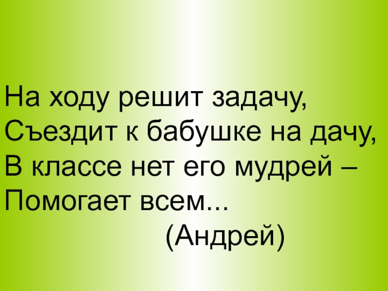 На ходу решит задачу,  Съездит к бабушке на дачу, В классе нет его мудрей –Помогает всем...