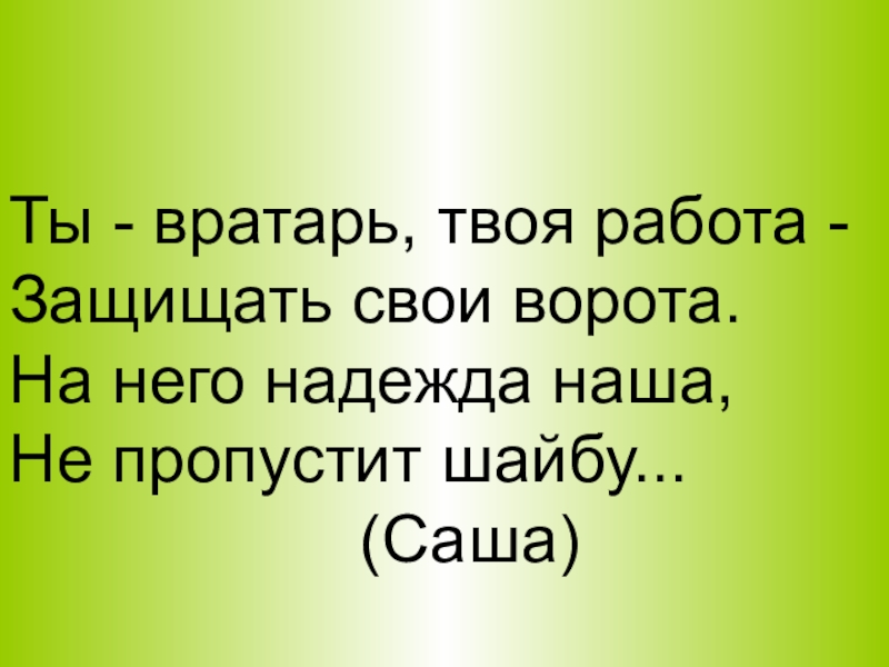 Ты - вратарь, твоя работа -Защищать свои ворота.На него надежда наша,Не пропустит шайбу...