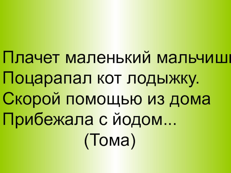 Плачет маленький мальчишкаПоцарапал кот лодыжку.Скорой помощью из домаПрибежала с йодом...