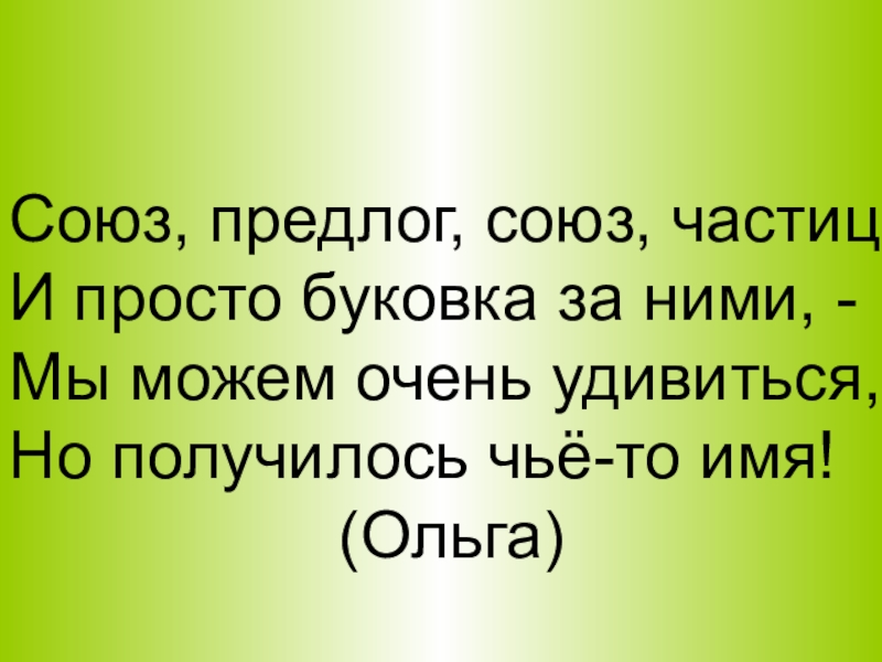 Союз, предлог, союз, частицаИ просто буковка за ними, -Мы можем очень удивиться, Но получилось чьё-то имя!