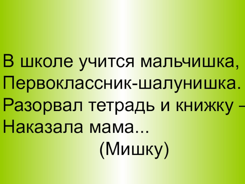 В школе учится мальчишка,Первоклассник-шалунишка.Разорвал тетрадь и книжку –Наказала мама...