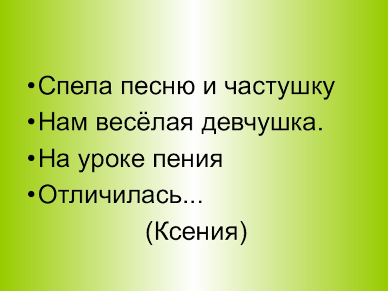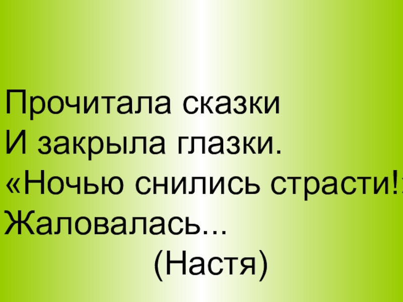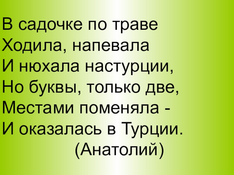 В садочке по травеХодила, напевалаИ нюхала настурции,Но буквы, только две,Местами поменяла -И оказалась в Турции.