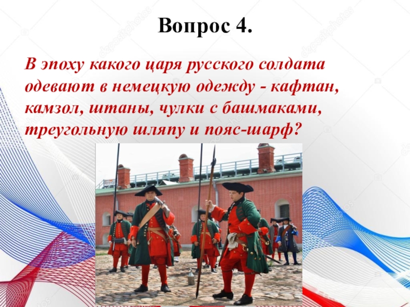 Вопрос 4.  В эпоху какого царя русского солдата одевают в немецкую одежду - кафтан, камзол, штаны,