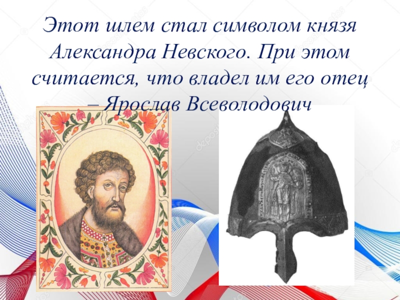 Слайд 11 Этот шлем стал символом князя Александра Невского. При этом считается, что