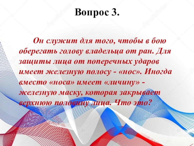 Вопрос 3.    		 Он служит для того, чтобы в бою оберегать голову владельца от ран.