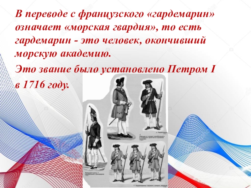 Слайд 19В переводе с французского «гардемарин» означает «морская гвардия», то есть гардемарин