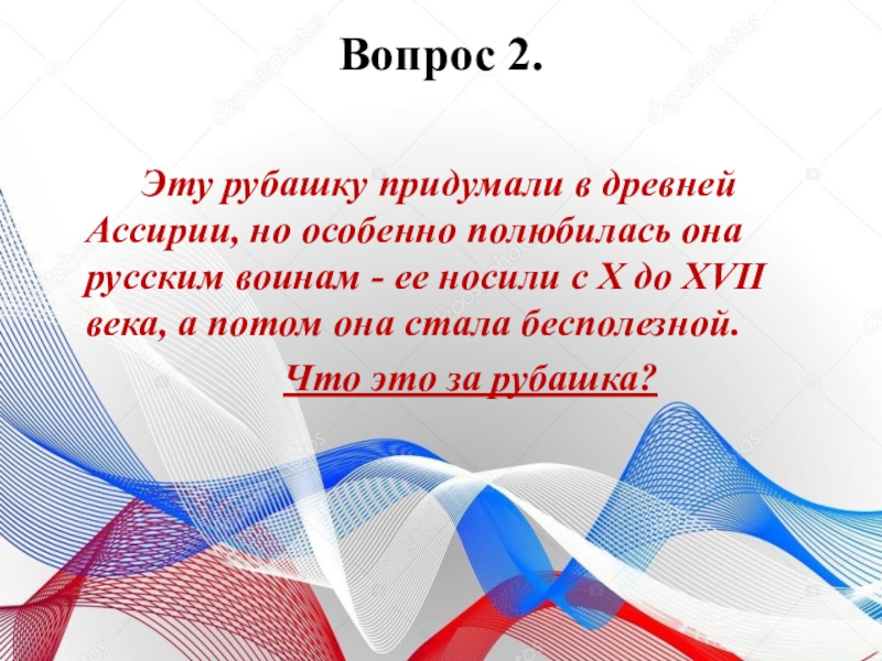 Вопрос 2.    		Эту рубашку придумали в древней Ассирии, но особенно полюбилась она русским воинам
