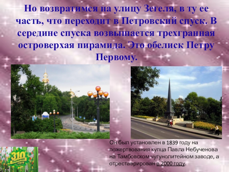 Он был установлен в 1839 году на пожертвования купца Павла Небученова на Тамбовском чугунолитейном заводе, а отреставрирован в 2000 году.