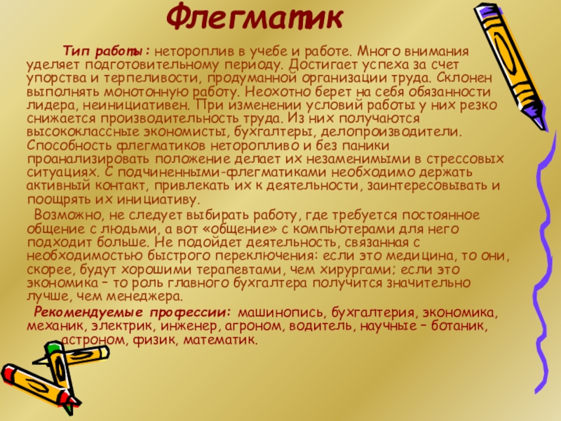 периоду. Достигает успеха за счет упорства и терпеливости, продуманной организации труда. Склонен выполнять монотонную работу. Неохотно берет на себя обязанности лидера, неинициативен. При изменении условий работы у них резко снижается производительность труда. Из них получаются высококлассные экономисты, бухгалтеры, делопроизводители. Способность флегматиков неторопливо и без паники проанализировать положение делает их незаменимыми в стрессовых ситуациях. С подчиненными-флегматиками необходимо держать активный контакт, привлекать их к деятельности, заинтересовывать и поощрять их инициативу.