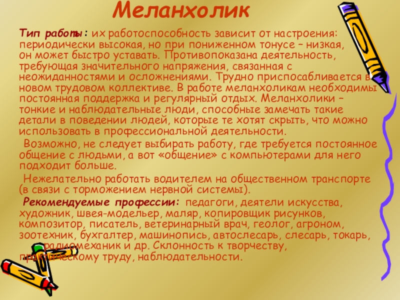 но при пониженном тонусе – низкая, он может быстро уставать. Противопоказана деятельность, требующая значительного напряжения, связанная с неожиданностями и осложнениями. Трудно приспосабливается в новом трудовом коллективе. В работе меланхоликам необходимы постоянная поддержка и регулярный отдых. Меланхолики – тонкие и наблюдательные люди, способные замечать такие детали в поведении людей, которые те хотят скрыть, что можно использовать в профессиональной деятельности.
